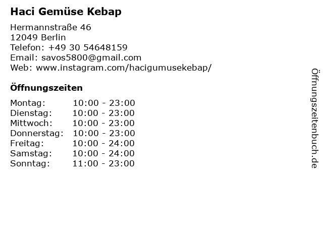 | Öffnungszeiten Haci Gemüse Kebap in Berlin anzeigen | |
