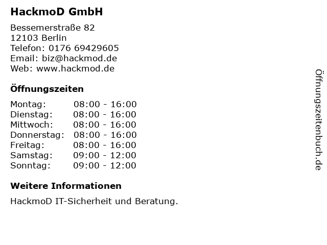 | Öffnungszeiten HackmoD GmbH in Berlin anzeigen | |