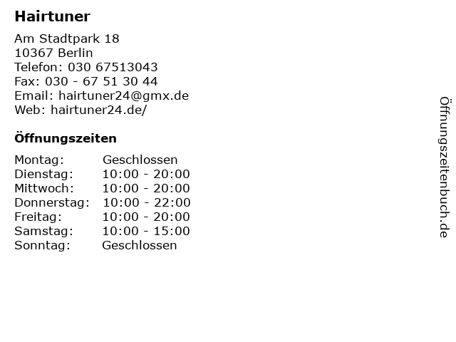 | Öffnungszeiten Hairtuner in Berlin anzeigen | |