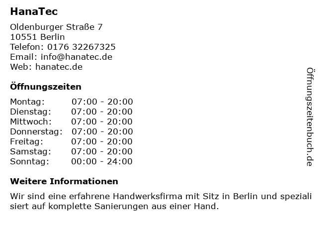 | Öffnungszeiten HanaTec in Berlin anzeigen | |