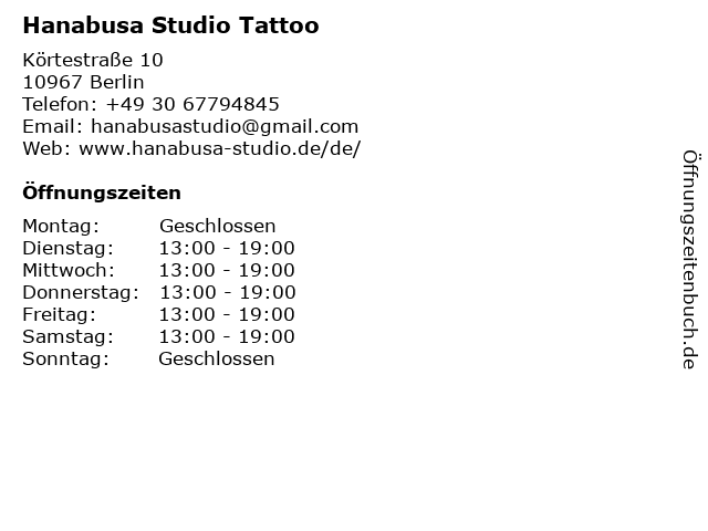 | Öffnungszeiten Hanabusa Studio Tattoo in Berlin anzeigen | |