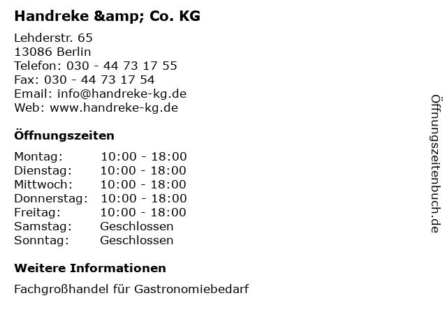 | Öffnungszeiten Handreke & Co. KG in Berlin anzeigen | |