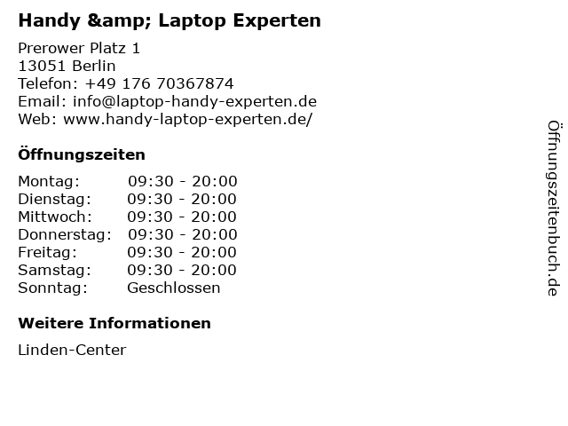 | Öffnungszeiten Handy & Laptop Experten in Berlin anzeigen | |
