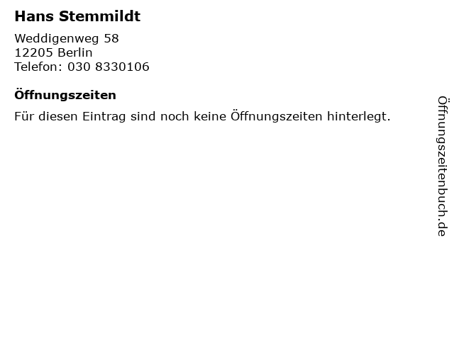 | Öffnungszeiten Hans Stemmildt in Berlin anzeigen | |