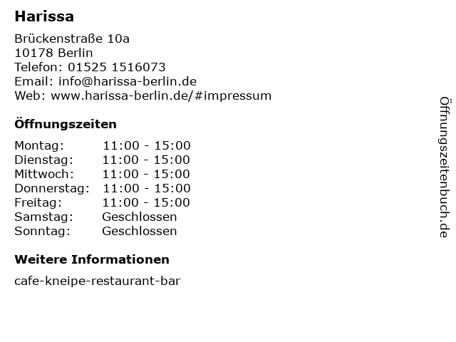 | Öffnungszeiten Harissa in Berlin anzeigen | |