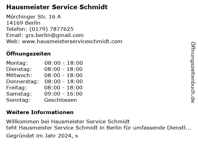 | Öffnungszeiten Hausmeister Service Schmidt in Berlin anzeigen | |
