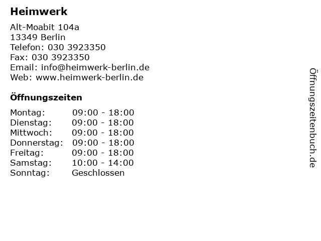 | Öffnungszeiten Heimwerk in Berlin anzeigen | |