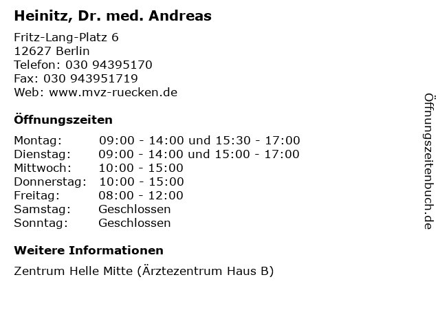 | Öffnungszeiten Heinitz, Dr. med. Andreas in Berlin anzeigen | |