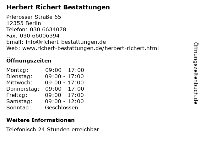 | Öffnungszeiten Herbert Richert Bestattungen in Berlin anzeigen | |