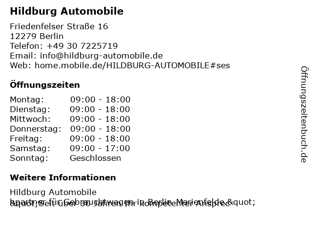 | Öffnungszeiten Hildburg Automobile in Berlin anzeigen | |