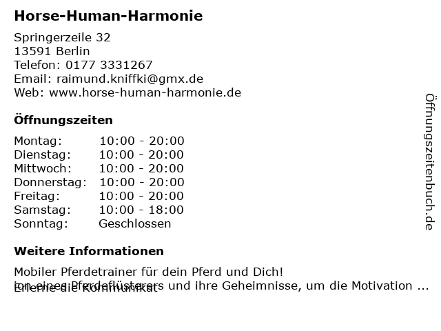| Öffnungszeiten Horse-Human-Harmonie in Berlin anzeigen | |