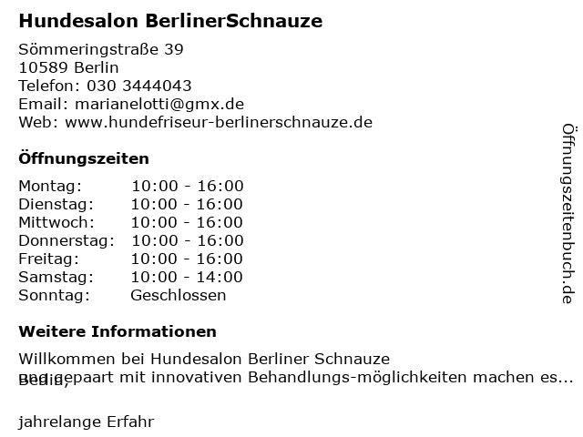 | Öffnungszeiten Hundesalon BerlinerSchnauze in Berlin anzeigen | |