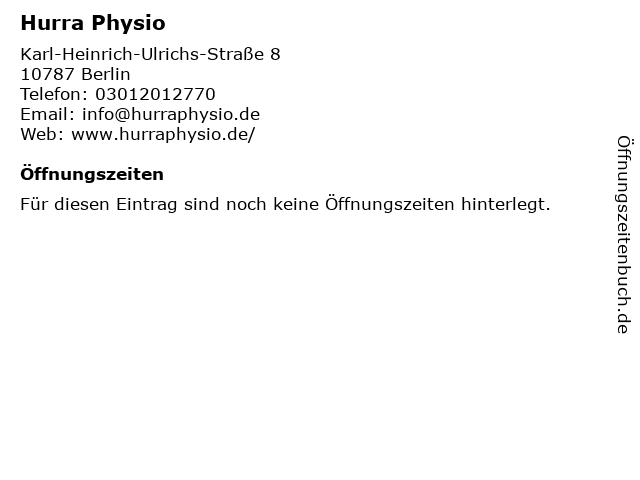 | Öffnungszeiten Hurra Physio in Berlin anzeigen | |