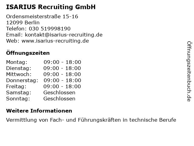 | Öffnungszeiten ISARIUS Recruiting GmbH in Berlin anzeigen | |