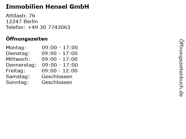 | Öffnungszeiten Immobilien Hensel GmbH in Berlin anzeigen | |