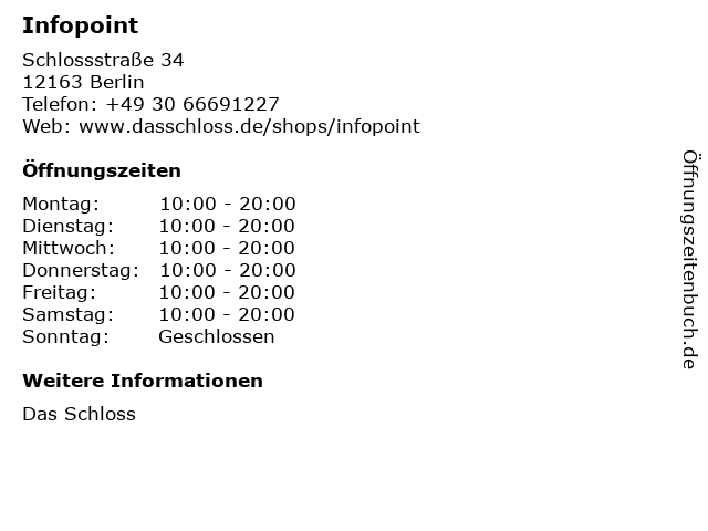 | Öffnungszeiten Infopoint in Berlin anzeigen | |