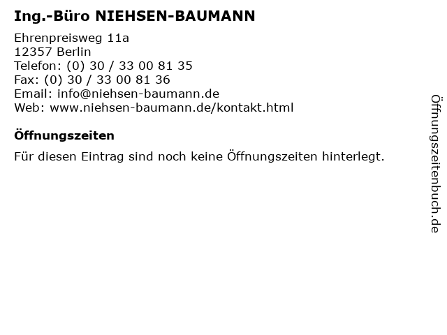 | Öffnungszeiten Ing.-Büro NIEHSEN-BAUMANN in Berlin anzeigen | |