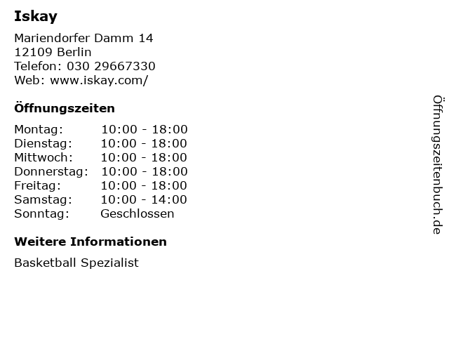 | Öffnungszeiten Iskay in Berlin anzeigen | |