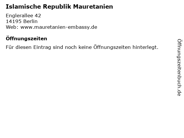 | Öffnungszeiten Islamische Republik Mauretanien in Berlin anzeigen | |