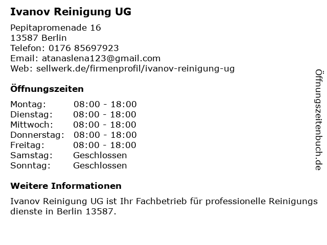 Öffnungszeiten Ivanov Reinigung UG in Berlin anzeigen | |