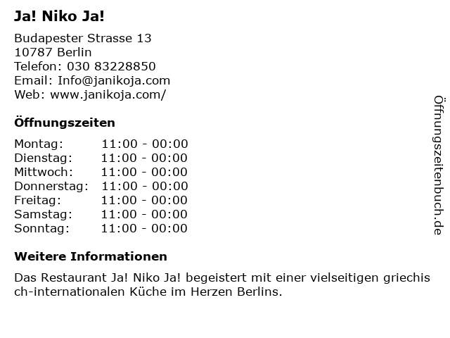 | Öffnungszeiten Ja! Niko Ja! in Berlin anzeigen | |