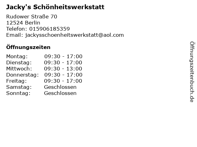 | Öffnungszeiten Jacky's Schönheitswerkstatt in Berlin anzeigen | |