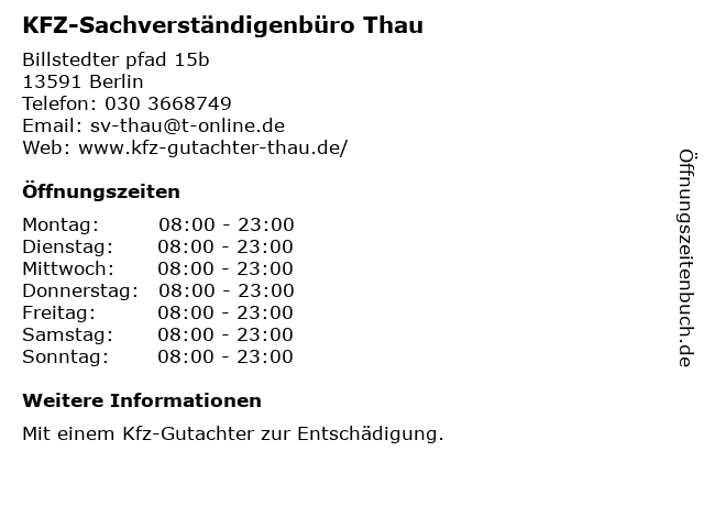 | Öffnungszeiten KFZ-Sachverständigenbüro Thau in Berlin anzeigen | |