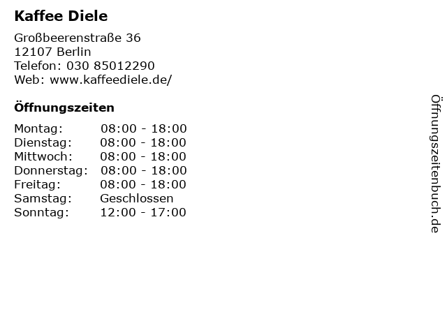 | Öffnungszeiten Kaffee Diele in Berlin anzeigen | |