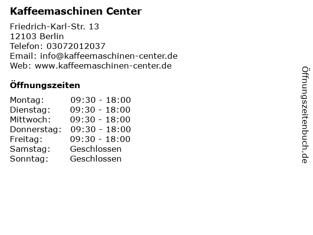 | Öffnungszeiten Kaffeemaschinen Center in Berlin anzeigen | |