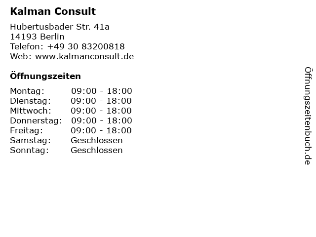 | Öffnungszeiten Kalman Consult in Berlin anzeigen | |