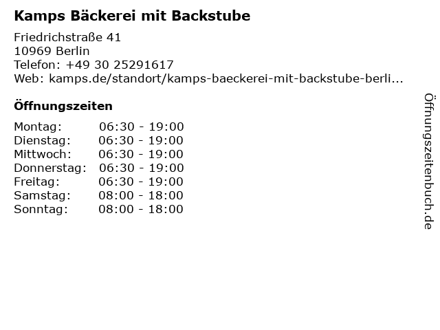 | Öffnungszeiten Kamps Bäckerei mit Backstube in Berlin anzeigen | |