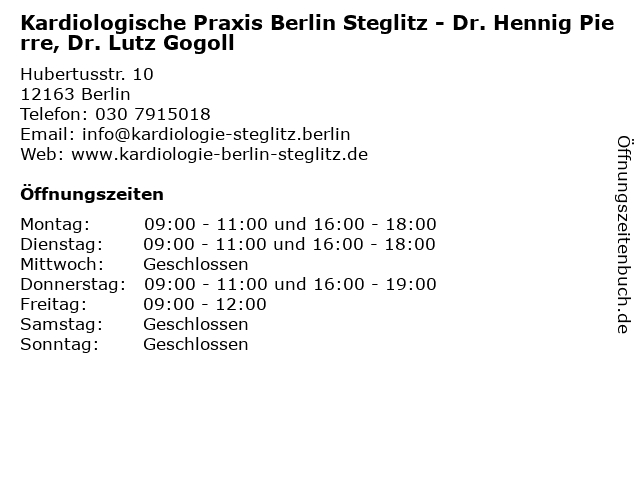 Branchen & Suchbegriffe zu Kardiologische Praxis Berlin Steglitz - Dr. Hennig Pierre, Dr. Lutz Gogoll:dr., gogoll, hennig, kardiologische, lutz, pierre, praxis, steglitz |
