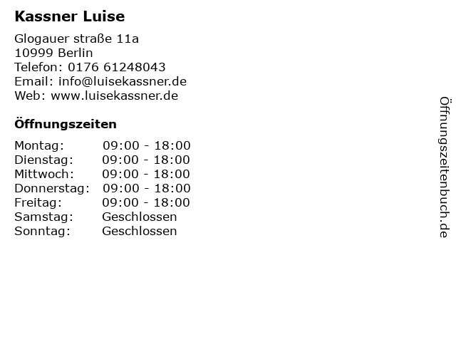 | Öffnungszeiten Kassner Luise in Berlin anzeigen | |