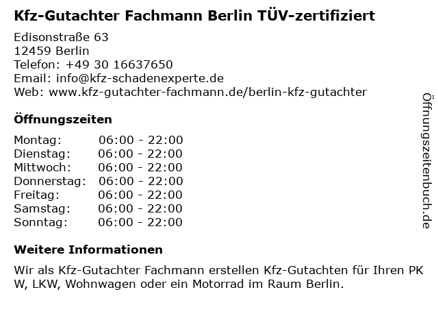 1 TÜV SÜD Auto Partner, Kfz Prüfzentrum Berlin-Schöneweide / Prüfstelle / Schadengutachten (Entfernung: 0,87 km) Michael-Brückner-Straße 25, 12439 Berlin 6 |