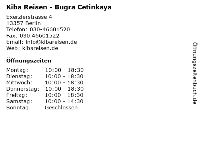 | Öffnungszeiten Kiba Reisen - Bugra Cetinkaya in Berlin anzeigen | |