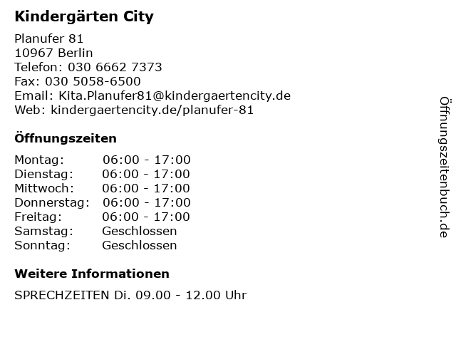 Öffnungszeiten Kindergärten City in Berlin anzeigen | |