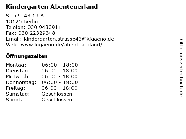 | Öffnungszeiten Kindergarten Abenteuerland in Berlin anzeigen | |