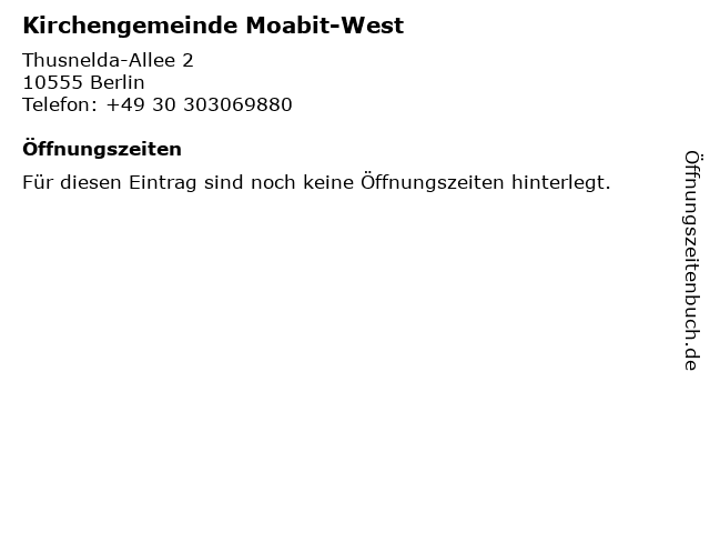 | Öffnungszeiten Kirchengemeinde Moabit-West in Berlin anzeigen | |