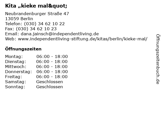 | Öffnungszeiten Kita „kieke mal" in Berlin anzeigen | |
