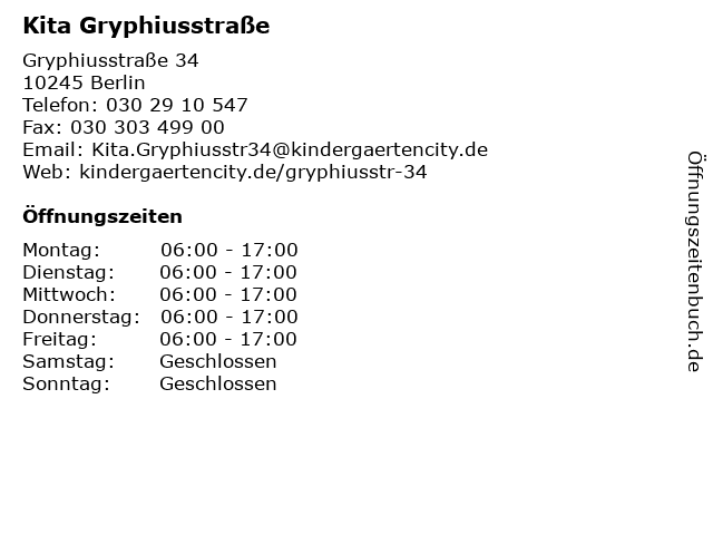 | Öffnungszeiten Kita Gryphiusstraße in Berlin anzeigen | |