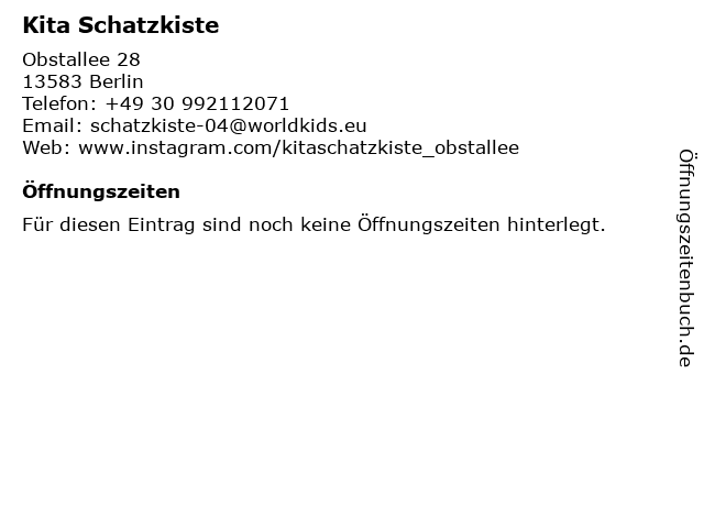 | Öffnungszeiten Kita Schatzkiste in Berlin anzeigen | |