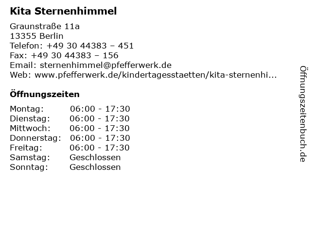 | Öffnungszeiten Kita Sternenhimmel in Berlin anzeigen | |