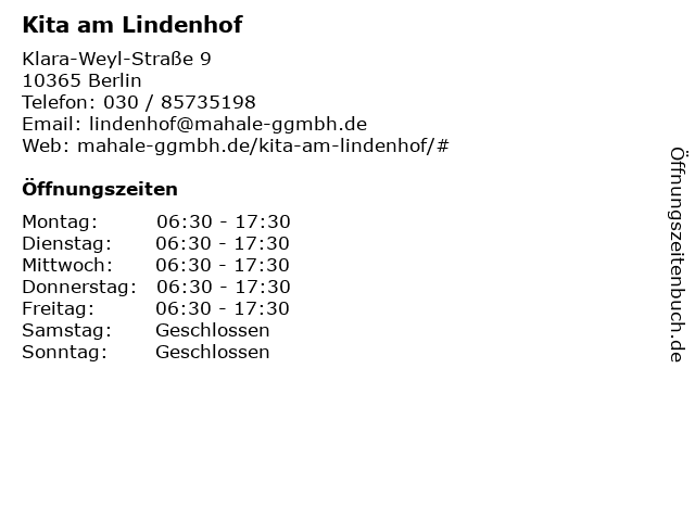 | Öffnungszeiten Kita am Lindenhof in Berlin anzeigen | |