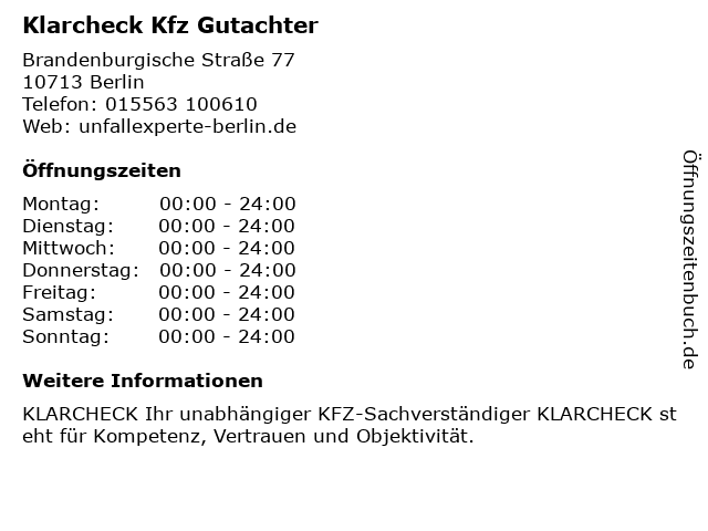 | Öffnungszeiten Klarcheck Kfz Gutachter in Berlin anzeigen | |