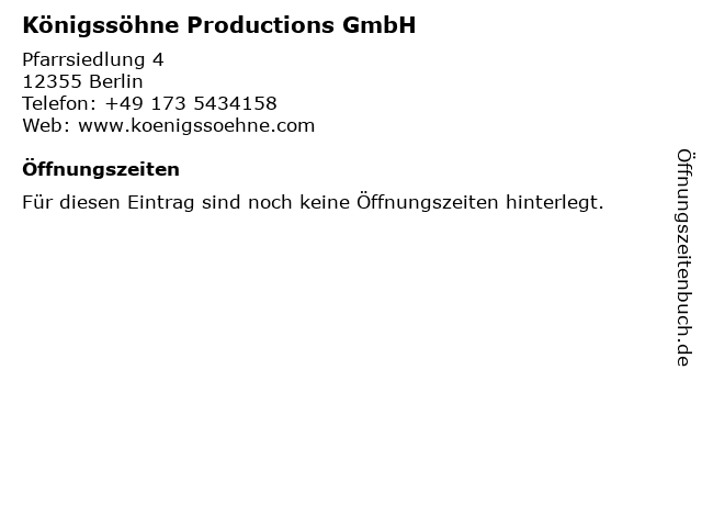 | Öffnungszeiten Königssöhne Productions GmbH in Berlin anzeigen | |
