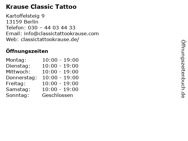 | Öffnungszeiten Krause Classic Tattoo in Berlin anzeigen | |
