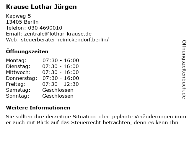 | Öffnungszeiten Krause Lothar Jürgen in Berlin anzeigen | |