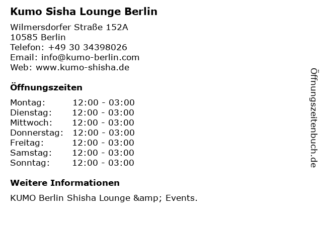 | Öffnungszeiten Kumo Sisha Lounge Berlin in Berlin anzeigen | |
