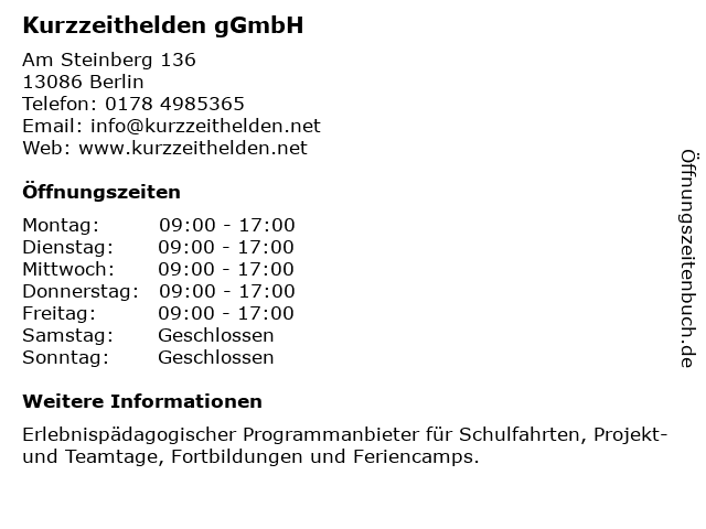 | Öffnungszeiten Kurzzeithelden gGmbH in Berlin anzeigen | |