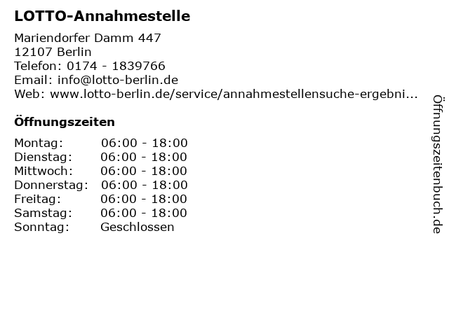 | Öffnungszeiten LOTTO-Annahmestelle in Berlin anzeigen | |